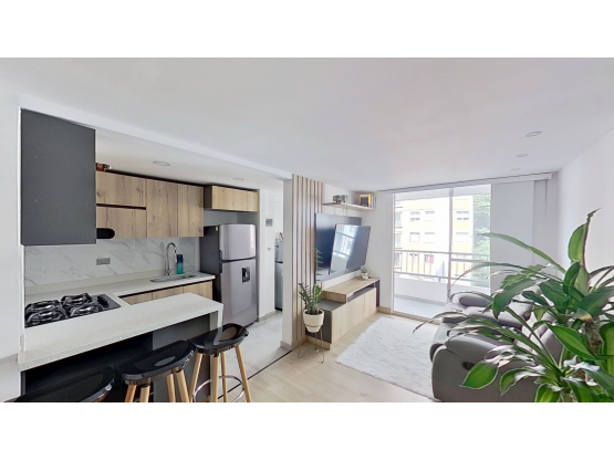 Apartamento en venta de 57 m², con vista interior, ubicado en un 9.º piso con acceso por ascensor, cuenta con parqueadero propio cubierto.  Consta de 2 habitaciones, 2 baños, sala-comedor, cocina integral y zona de lavandería. Cuenta con piso laminado en habitaciones y zona social, y porcelanato en baños y cocina.